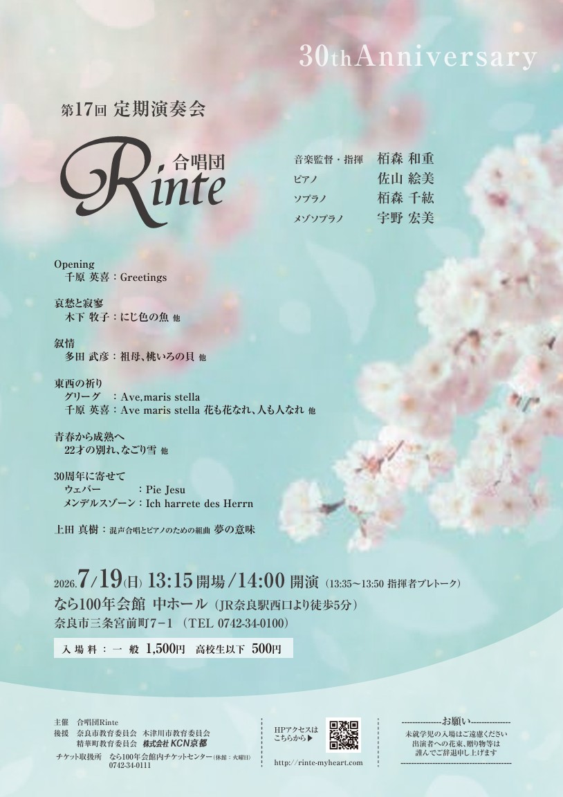 日時:2026年7月19日(日)13:15開場 14:00開演 (13:35~13:50指揮者プレトーク) 場所:なら100年会館中ホール チケットのお求めは、なら100年会館 または、団員まで(まだ販売していません)